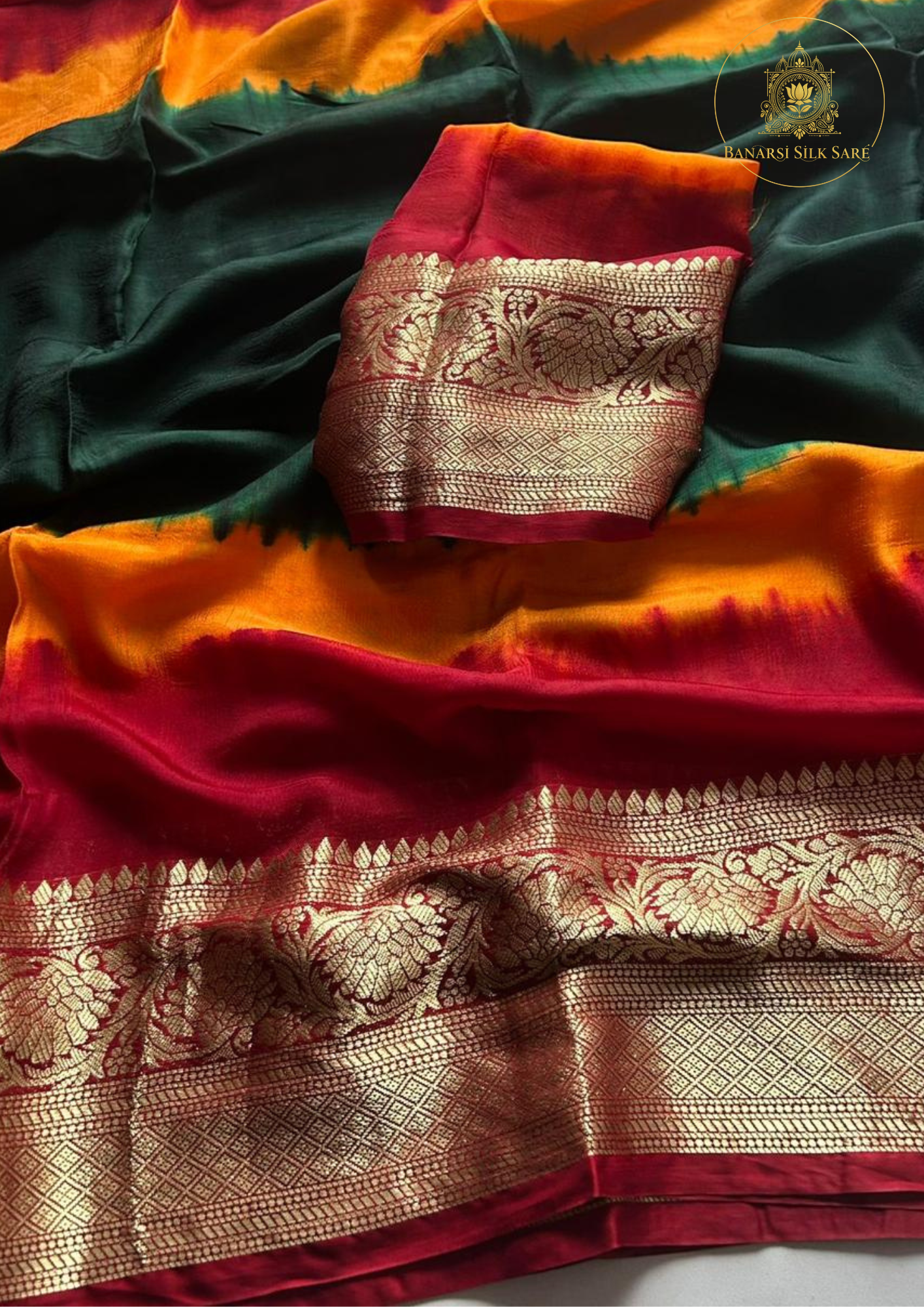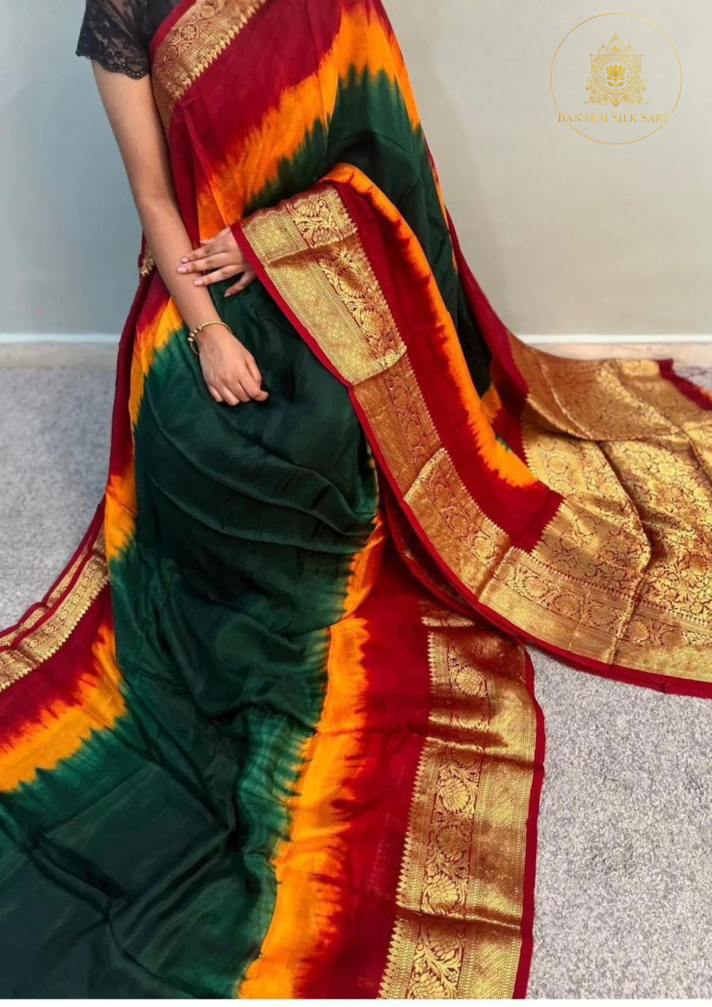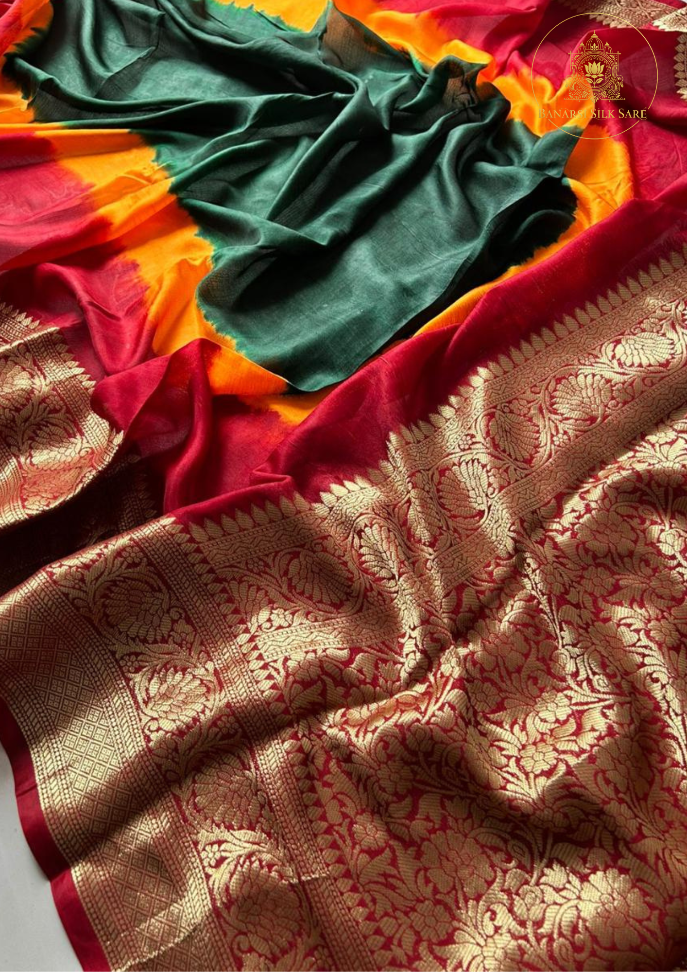 This beautiful saree features hand dyeing (Bandhani) work, giving it a rich and artistic look. The running blouse and vibrant two-colour shades add to its timeless appeal.